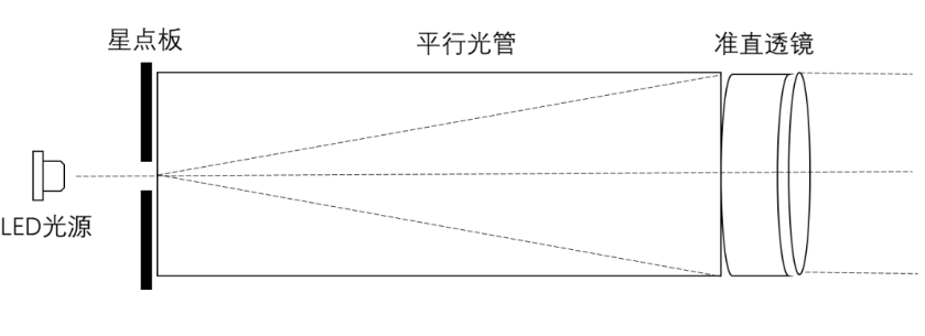 星光模擬器由LED光源,星點板,平行光管,準直透鏡,驅動電源,控制軟件等組成。通過調節(jié)LED的驅動電流實現(xiàn)不同級別的亮度輸出,從而實現(xiàn)不同星等亮度要求。