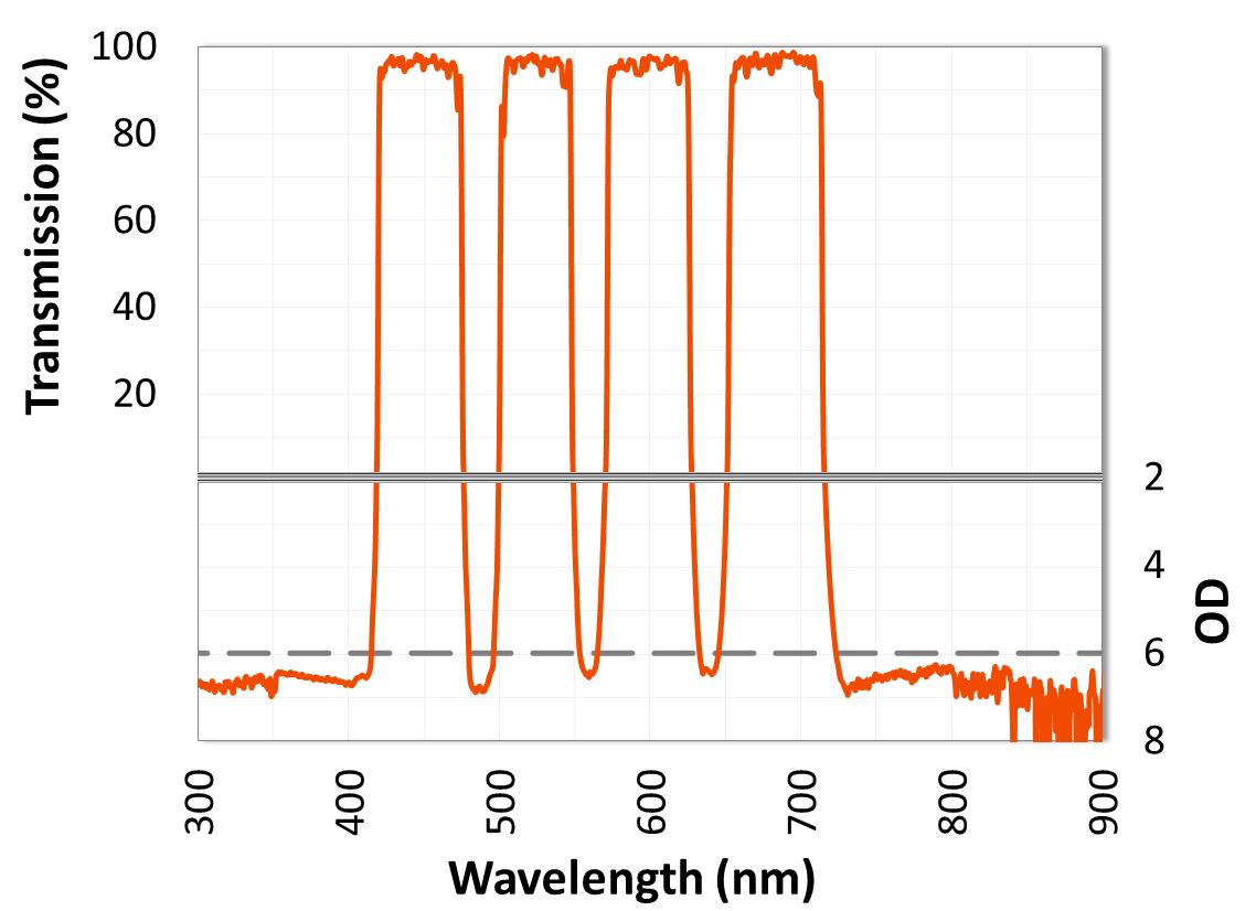 ULTRA系列多頻帶通濾光片可以設(shè)計(jì)為10個(gè)以上的透過波段,波段之間的OD值大于8,超高的截至陡度,高達(dá)98%的透過率。 它們非常適合用作熒光技術(shù)中的激發(fā)或發(fā)射濾光片,要求在單個(gè)樣本中同時(shí)檢測多個(gè)熒光團(tuán)。