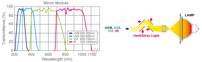 該組件由四個(gè)冷面鏡組成,用來阻擋氙燈多余的熱量,獲得期望的光通量。LAX-C100有4種類型的鏡面模塊。