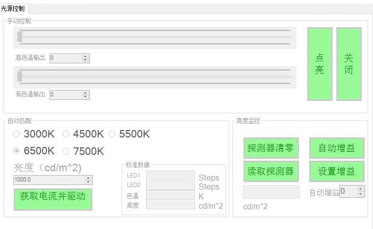 系統(tǒng)軟件界面如下圖。軟件界面清晰直觀,可手動調節(jié)LED的電流大小,也可按照步數(shù)輸入期望的數(shù)值,實現(xiàn)精細調節(jié),實際調節(jié)精度遠大于2星等。